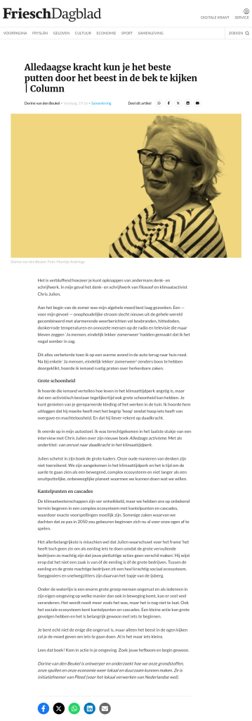 ‘Ik veerde op in mijn autostoel. Ik was terechtgekomen in net laatste stukje van een interview met Chris Julien over zijn nieuwe boek Alledaags activisme. Met als ondertitel: van onrust naar daadkracht in het klimaattijdperk.’